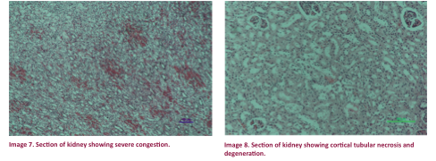 necrosis of the renal cortex, degeneration of tubular cells and congestion as