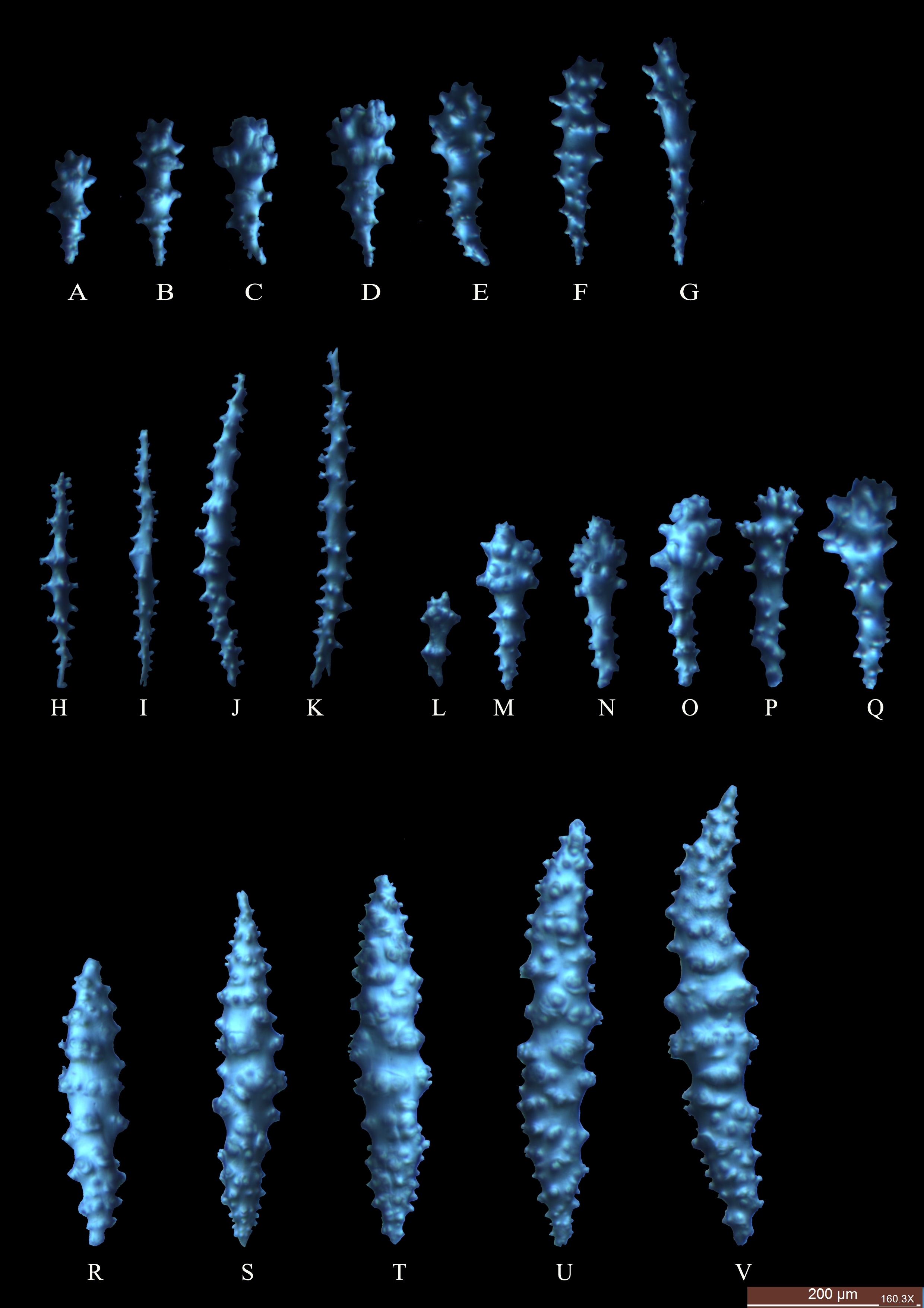 - Fig. 3: Sarcophyton birkelandi Verseveldt, 1978. A-G Sclerites of capitulam exterior, H-K Sclerites of capitulam interior, L-Q Sclerites of stalk exterior, R- V Sclerites of stalk interior.