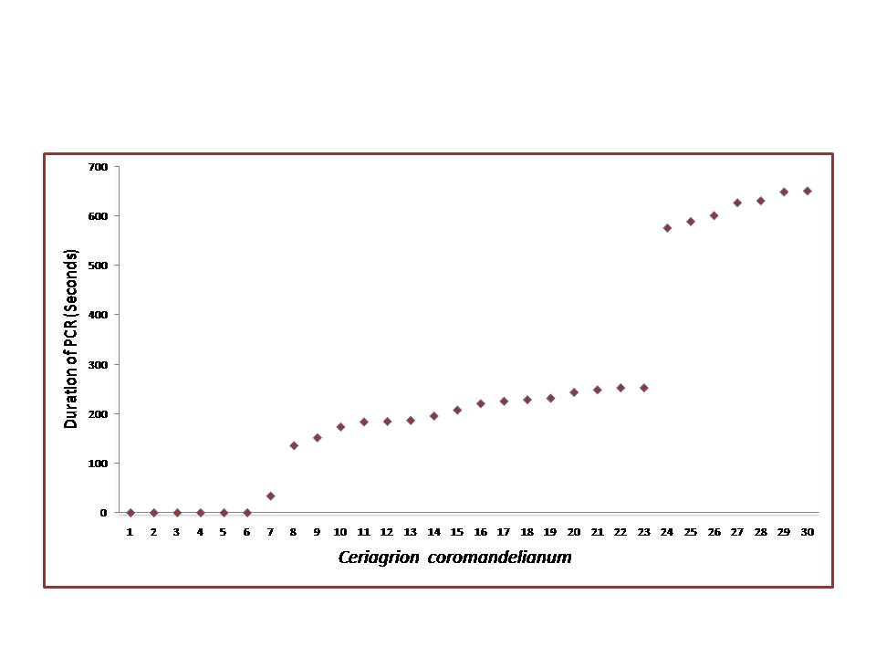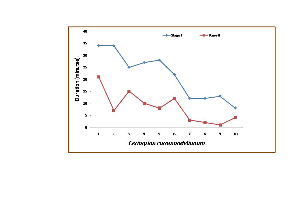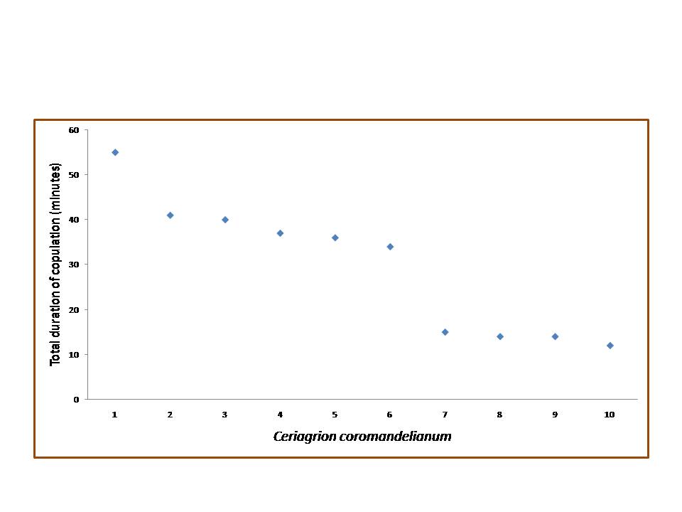 The Coromandel Damselfly Ceriagrion coromandelianum can be easily identified because of its bright yellow abdomen, greenish thorax and eyes. In females, the abdomen is darker with light brown colouration extending to dark brown towards the terminal end. The documentation of the reproductive behaviour of Ceriagrion coromandelianum was carried out at the botanical garden of Hislop College, Nagpur, India. The males of C. coromandelianum arrive early in the morning by 07:00hr at the ovipositing site. They belong to “sit and wait†type of mate-location. While perched and waiting for the female to arrive they at times exhibit abdominal bobbing, and oviposition posture. The territorial area of male C. coromandelianum is very small, within a range of about 45cm around his perch. There is no precopulatory courtship display and the male move toward the arriving receptive female and directly tries to form a tandem link. The other males of the group follow the pair. The tandem pair flies towards the safety of the surrounding vegetation to copulate. Before copulation, the male fills his penis vesicle with sperm material by the process of “intra male sperm translocation†which lasts for 30±8 seconds. The female curves her abdomen ventrally forward so that her gonopore which is located between the eighth and ninth sternite comes to lie before the secondary copulatory apparatus of the male and forms a strong genital link, to form the copulatory wheel. The copulation duration can be long (34–55 min) or short (12–15 min). Two stages of copulation depending upon the pumping movement of the couple can be differentiated. During the first stage, the male rhythmically and forcefully depresses and stretches the first two abdominal segments, vigorously pumping the penis inside the female vagina which accounts for 72% of the copulation duration. The second stage starts with rapid short thrusting movement which are not forceful but exhibit shallow movements of the first two abdominal segment of the male. The tandem pairs after copulation may directly move for oviposition or settle around the surrounding foliage and exhibit “post-copulatory resting†(PCR) behaviour. It is noted that 23.3% females immediately commence oviposition, 53.4% exhibit brief, while 23.3% display prolonged PCR behaviour.Â
